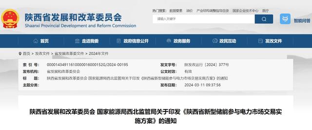 3月11日,陜西省發(fā)展和改革委員會 國家能源局西北監(jiān)管局發(fā)布關(guān)于印發(fā)《陜西省新型儲能參與電力市場交易實施方案》的通知。